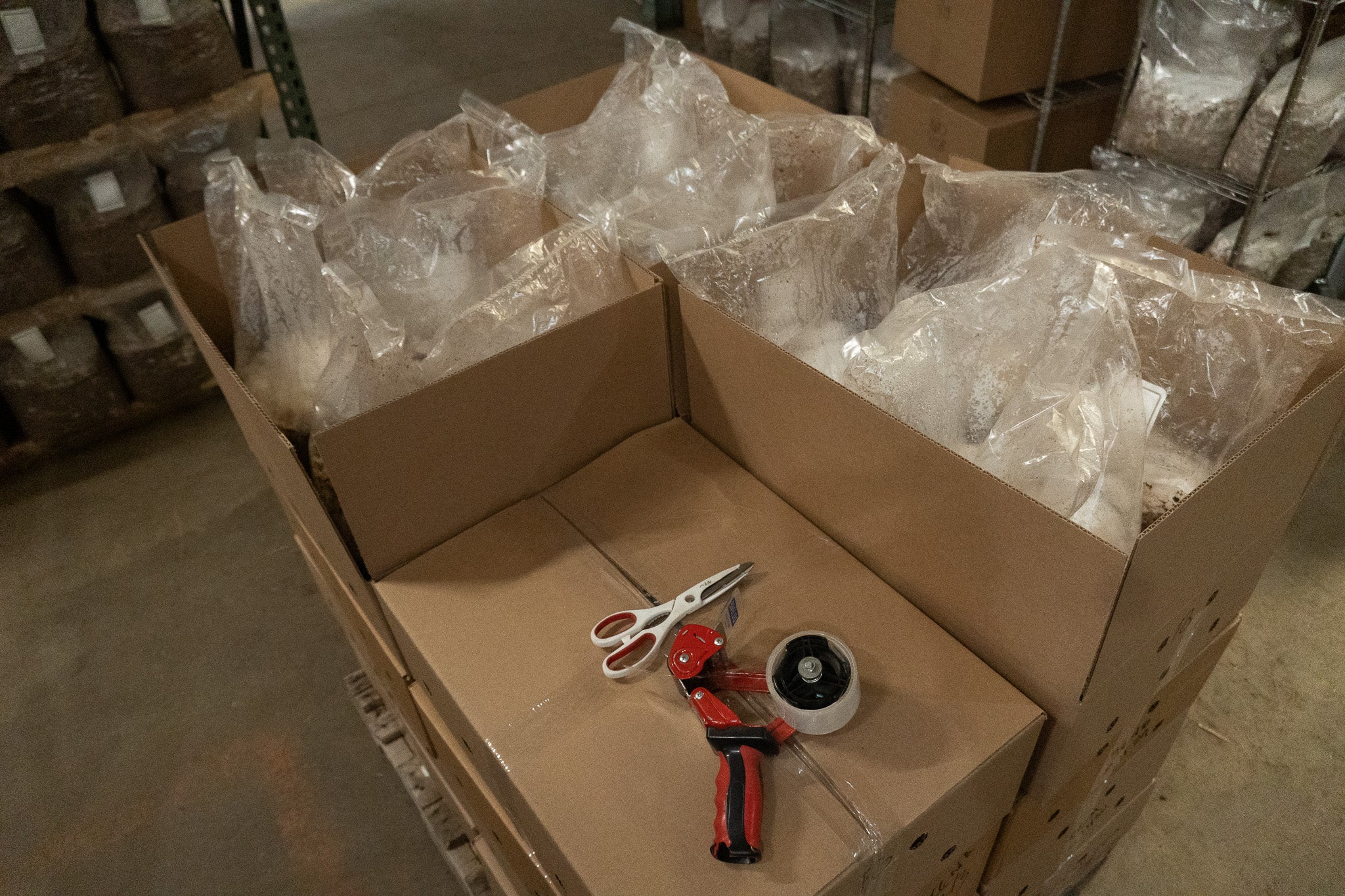 After the blocks have finished the incubation process, we then pack them into vented boxes on a pallet and ship them out to our customers.