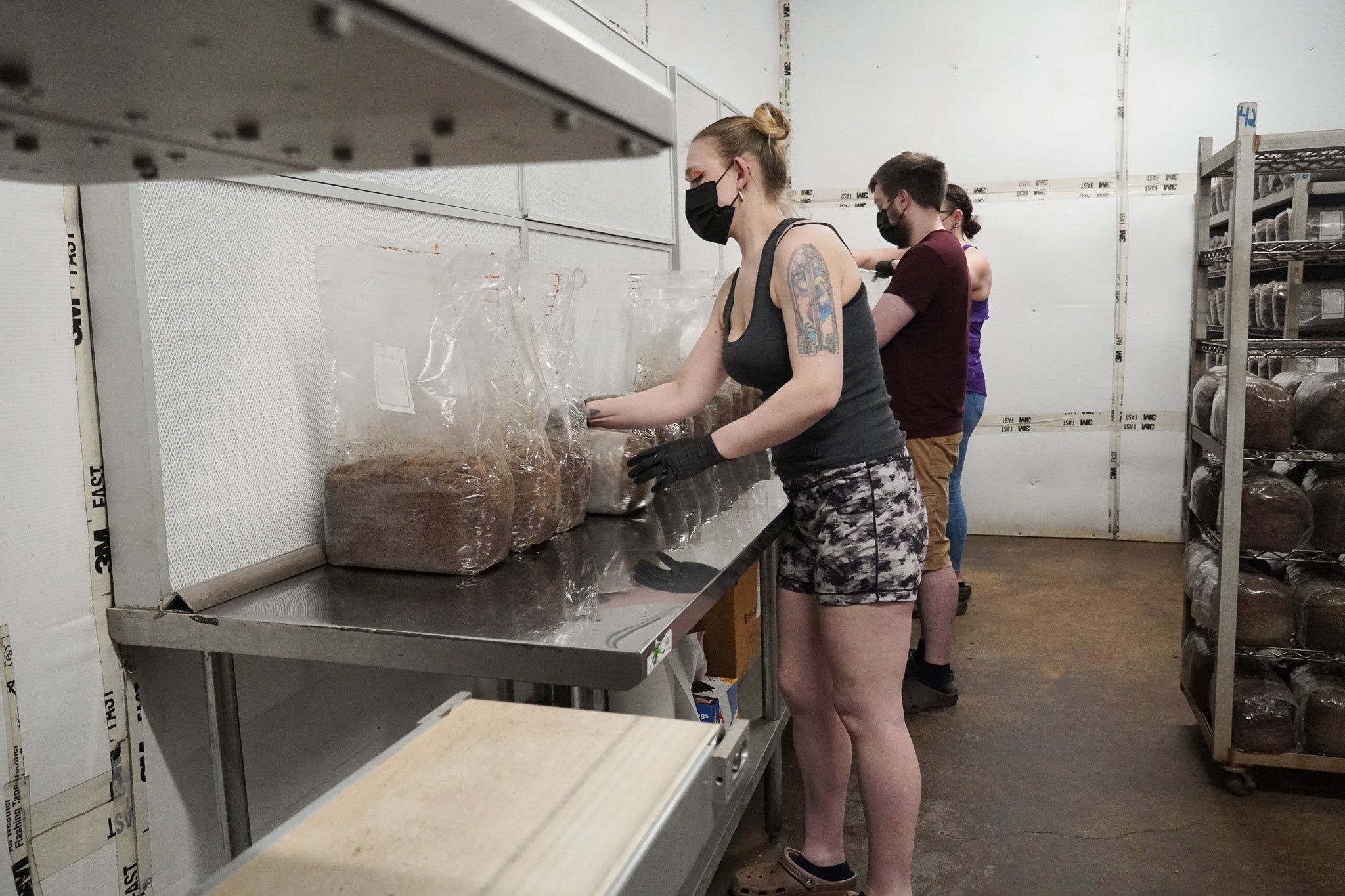 After the 10lb blocks have been steamed, they are put in the lab where we inoculate them with grain spawn.