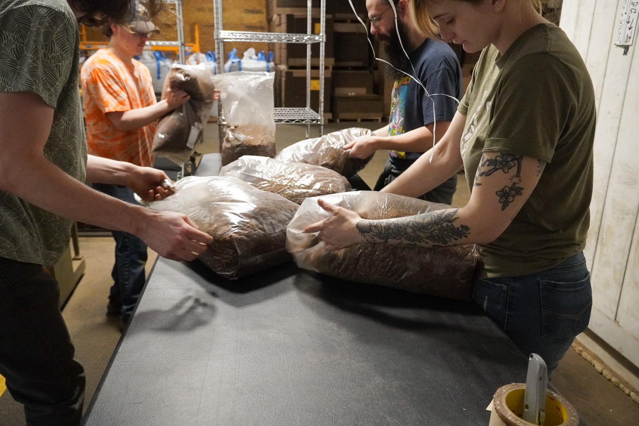 Once the bags are inoculated they are sent to the shake table where our substrate team evenly distributes the spawn by shaking the bags.