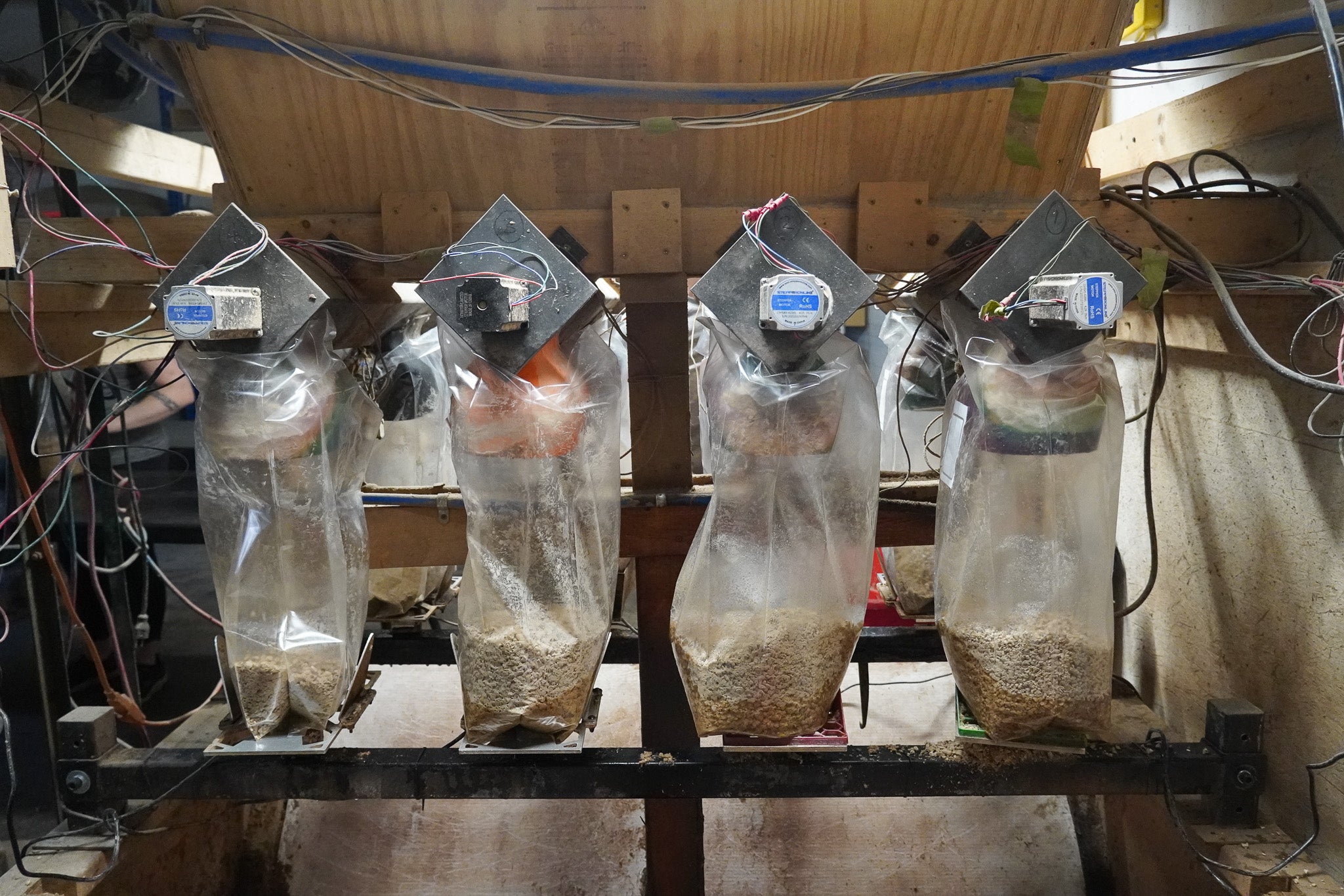 The first step of the process is what we call 'the mix.' Here we use our Fenrir system to hydrate 10lb bags of our 'masters mix' before folding and putting them on racks. Once this is done they are ready to steamed and sterilized!